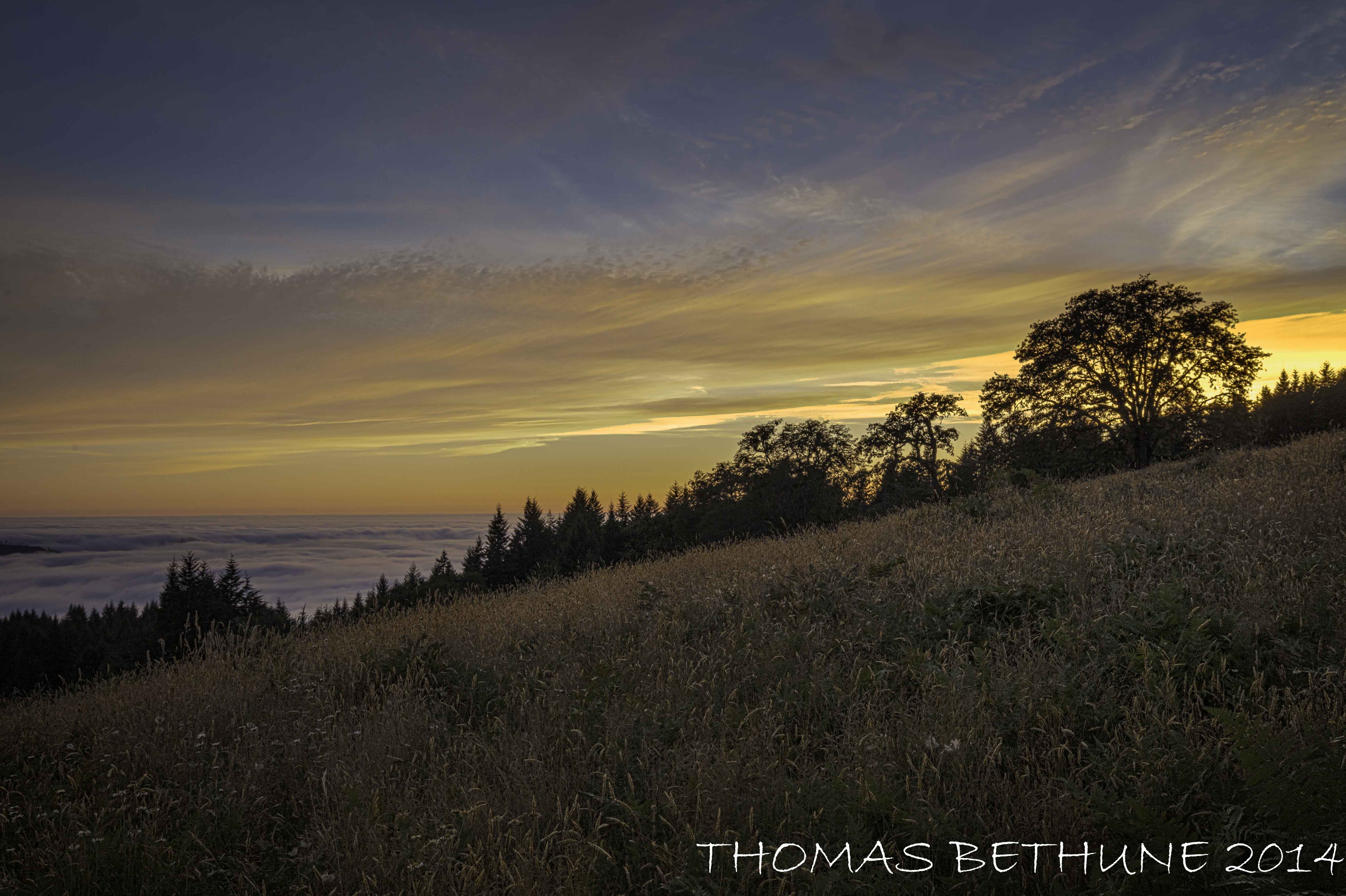 This image is another from the series that I took Saturday evening atop the southwest slope of Snow Camp Mountain in Humboldt County. This location is in the prairie, oak, and fir environment, yet it is only about a dozen miles from the coast. The “sea” of fog in the bottom right is blanketing the redwood forest environment which is at the lower elevations just below.